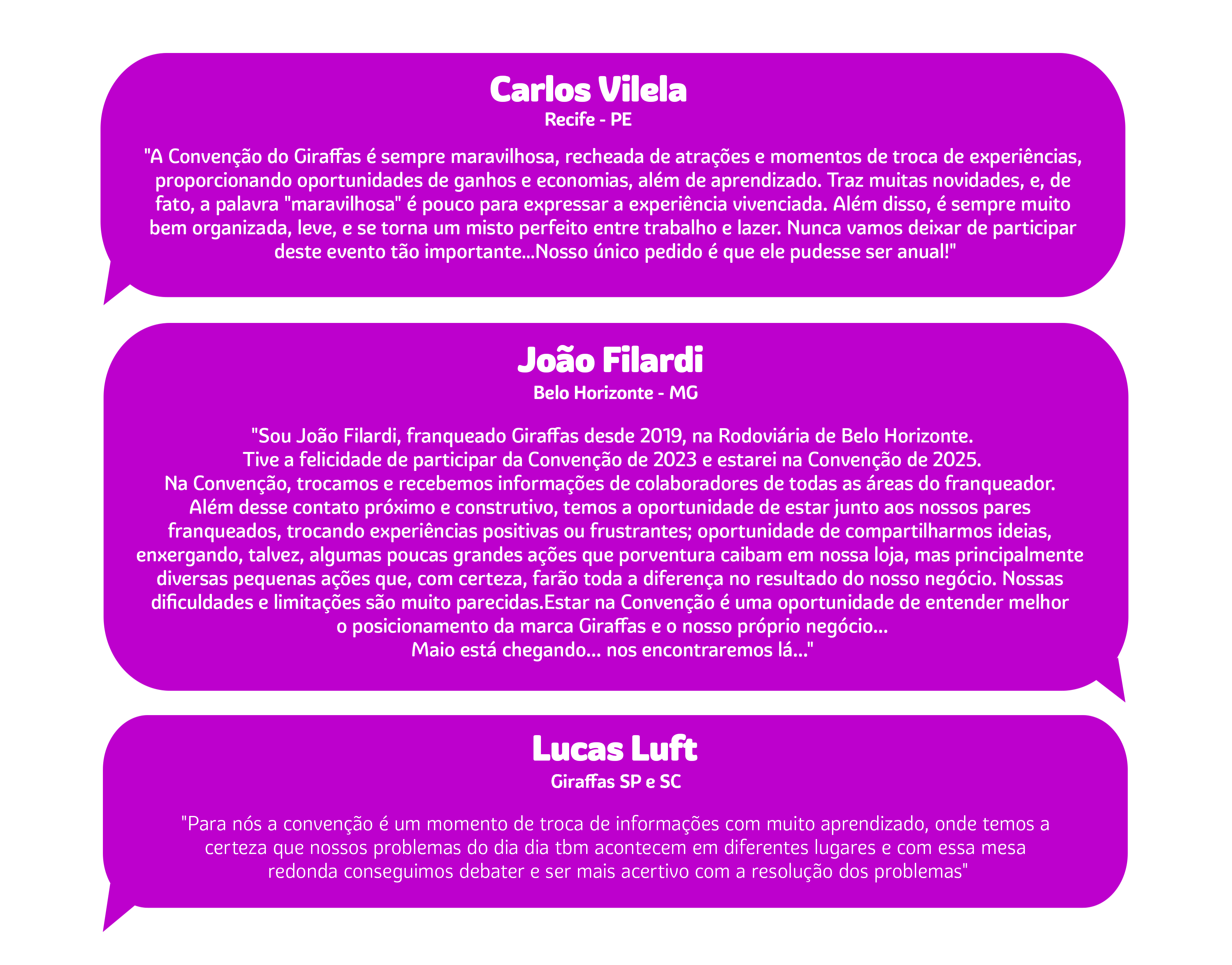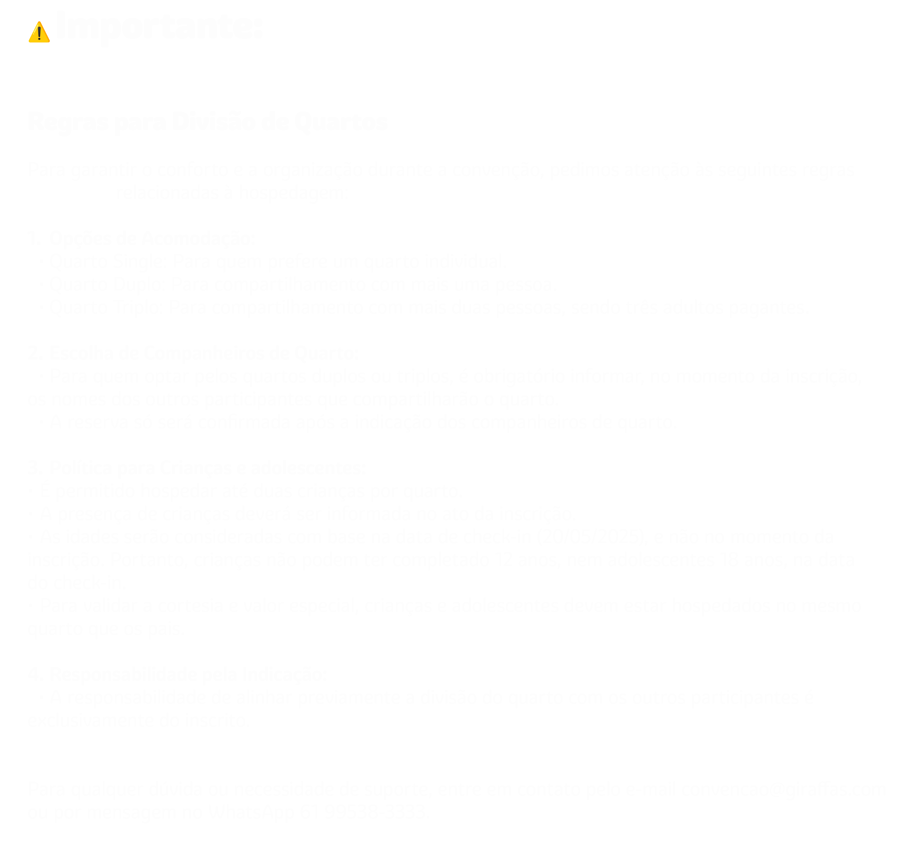 A partir de agora, as inscrições para a convenção serão realizadas exclusivamente pelo e-mail convencao@giraffas.com, mediante disponibilidade de vagas e quartos restantes.